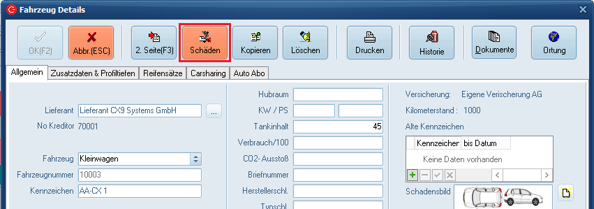 Abgerechnet kann der Schaden dann an den Kunden und an die Versicherung, über diese Felder.