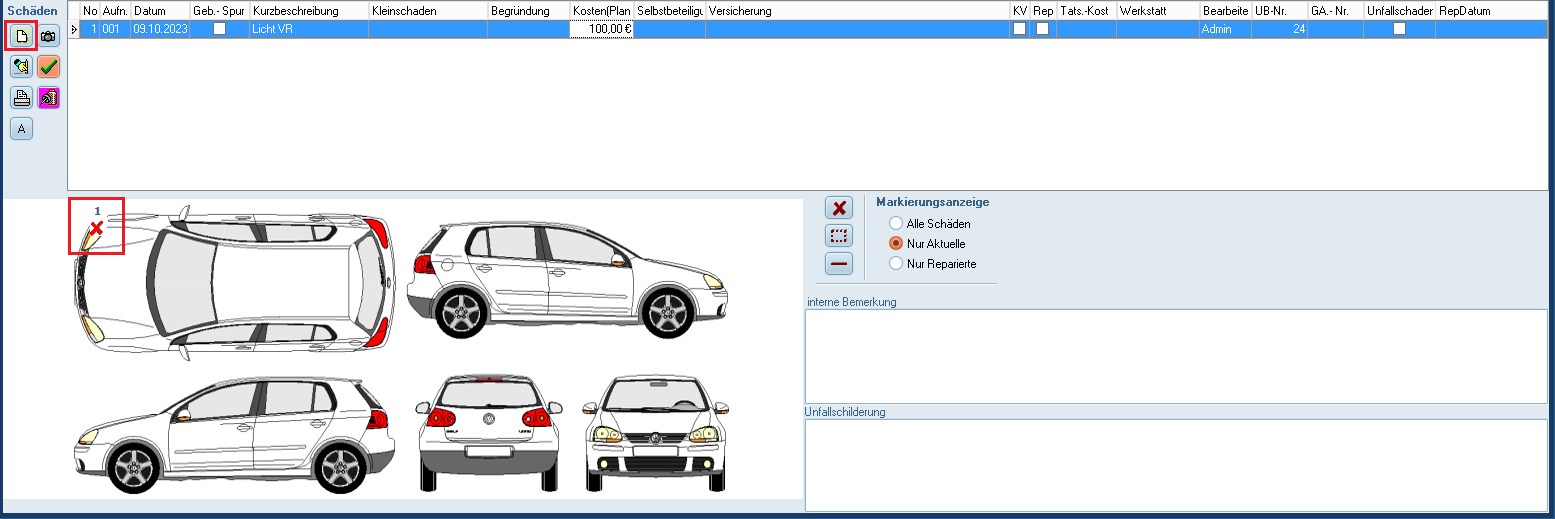 Nach dem Ausfüllen der Schadensakte (nach Bedarf) kann die Schadensposition angelegt und auf dem Fahrzeugpiktogramm markiert werden.