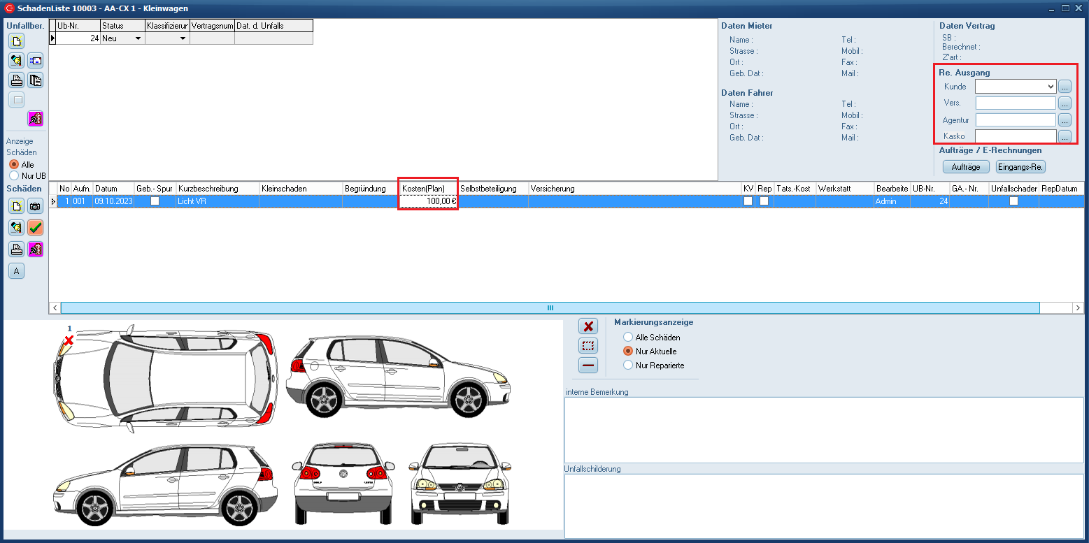 Je nachdem ob der Schaden mit oder ohne Mietvertrag aufgenommen wurde, wird eine Vertragsnummer in der Schadensakte hinterlegt oder das Feld bleibt frei.