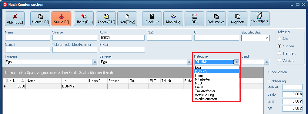 Bei der Aufnahme einer Reservierung oder eines Mietvertrages stellt man die „Kategorie“ der angezeigten Kunden auf „DUMMY/Name "."“ (bedeutet Platzhalter) und lässt sich diese durch Klick auf „Suche(F2)“ anzeigen.