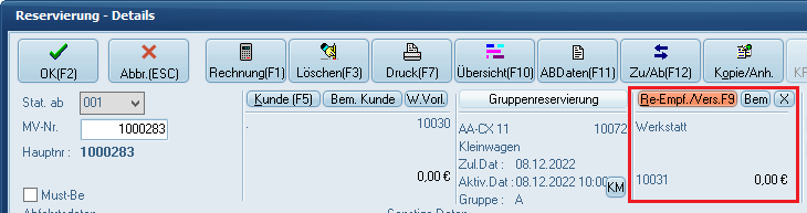 - Durch Klick auf „RE-Empf./Vers.F9“ muss die Werkstatt als Rechnungsempfänger festgelegt werden.