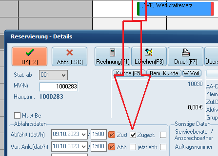 Ist die Rückmeldung/Check-In später als geplant, muss unter Umständen das geplante Abholdatum ebenfalls in der Maske „Zu/Ab(F12)“ angepasst werden.