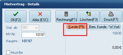 - Der betroffene Mietvertrag wird aufgerufen, z.B. Doppelklick in der Dispo oder über „Recherche-F10“ -> „Vertrag(F3)“ direkt über die Mietvertragsnummer.