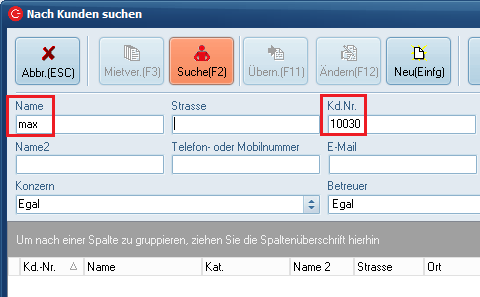 - Im Feld „Name“ wird der Name des Kunden eingegeben oder ein Teil des Namens, WICHTIG: die vorbelegte „Kd.Nr.“ entfernen, dann „Suche(F2)“ klicken.