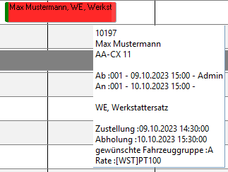 Die roten Balken am Anfang und Ende der Reservierung zeigen an, dass das Fahrzeug zugestellt und abgeholt werden muss.