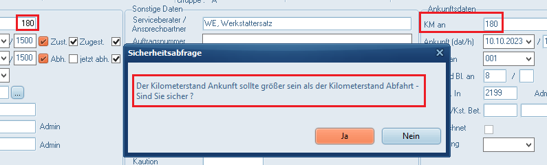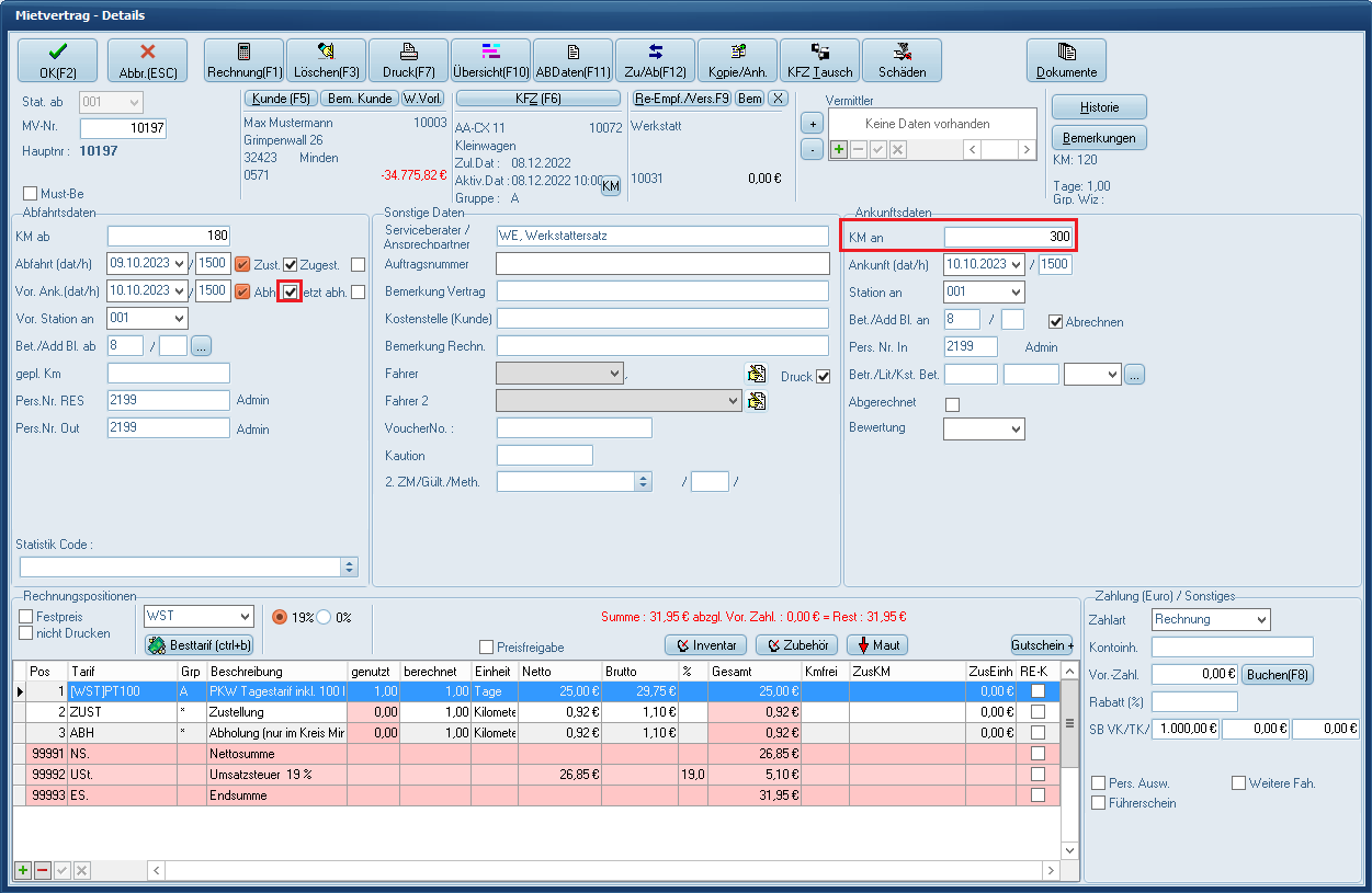 Ist das Fahrzeug abgeholt, wird im Mietvertrag der Haken „jetzt abh.“ Gesetzt und der korrekte Km-Stand eingegeben. Die Eingabe wird mit Klick auf „OK(F2)“ abgeschlossen.