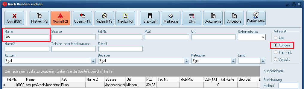 - Durch Klick auf „Kunde (F5)“ wird die Maske „Nach Kunden suchen“ aufgerufen.