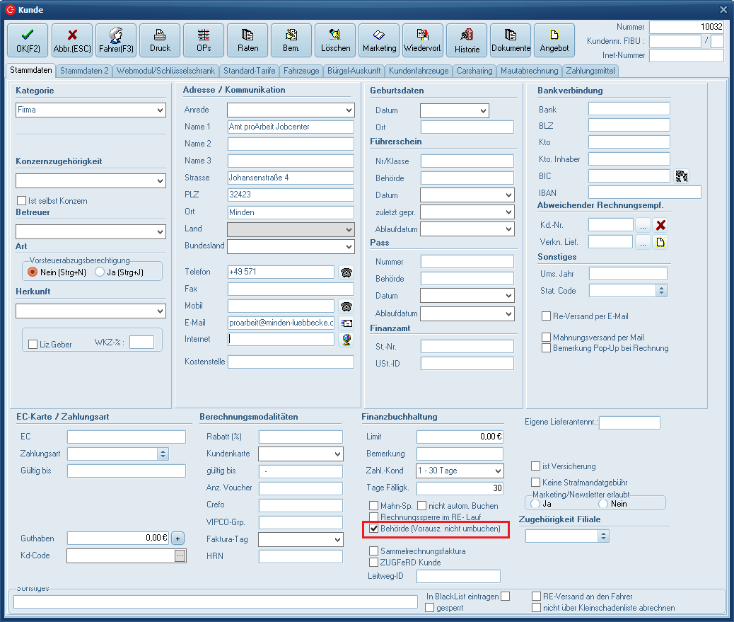 - Beim Rechnungsempfänger, hier das Jobcenter, muss folgender Haken im Kundenstamm gesetzt sein „Behörde (Vorausz. Nicht umbuchen)“. Bitte jedes Mal kontrollieren! Die Kundenstammdaten werden aus Maske „Nach Kunden suchen“ durch Markieren des entsprechenden Datensatzes und Klick auf „Ändern(F12)“ geöffnet.