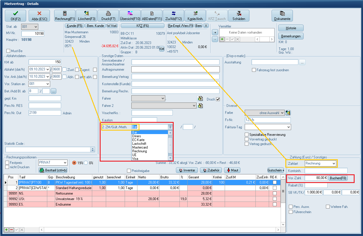 - Im Mietvertrag muss dann zur eigentlichen Zahlungsart „Rechnung“ im zweiten Zahlungsmittel, die Zahlart des Kunden ausgewählt werden. Anschließend wird beim Buchen auch diese Zahlart verwendet.