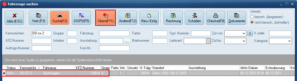 Jetzt kann über die Fahrzeugsuche das Tauschfahrzeug gesucht und durch einen Klick auf „Übern(F11)“ übernommen werden.