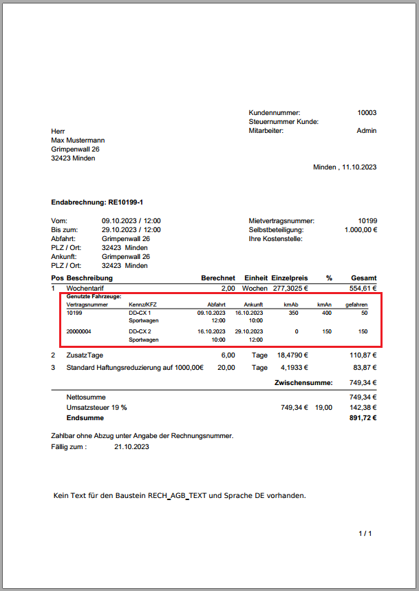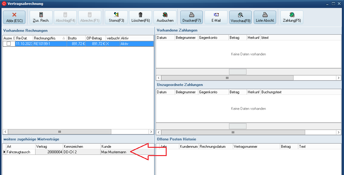 Bei der Vertragsabrechnung werden alle gefahrenen Fahrzeuge in „weitere zugehörige Mietverträge“ angezeigt.