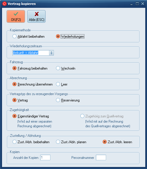 Ob die Zustellung oder Abholung, falls eine eingetragen wurden, mit kopiert werden soll, kann man hier festlegen.