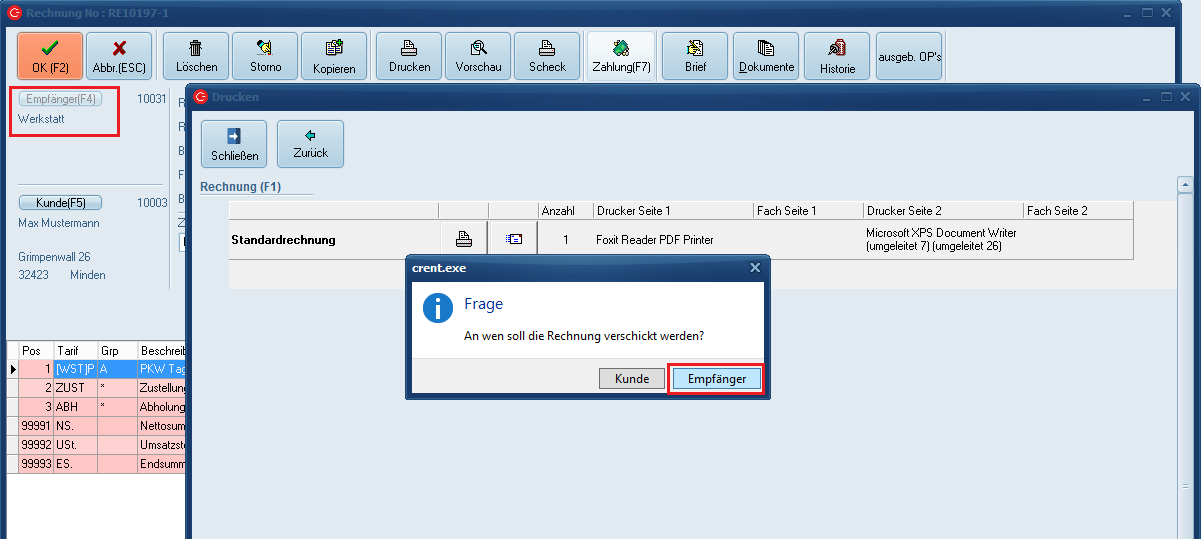 Beim Versand der Rechnung per E-Mail wird noch nachgefragt, an wen die Rechnung per E-Mail geschickt werden soll. Je nach Auswahl wird dann die E-Mail-Adresse des Kunden oder die des Rechnungsempfängers vorbelegt. Hier soll die Rechnung an die Werkstatt geschickt werden, darum klickt man auf „Empfänger“.