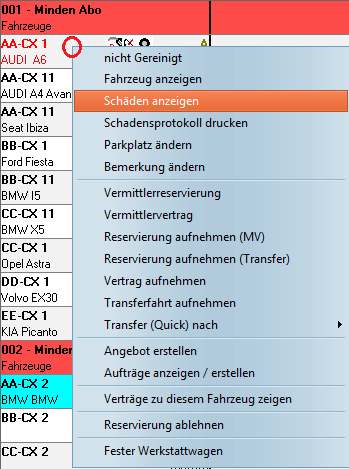Oder in der Dispo im Kontextmenü der rechten Maustaste auf Schaden anzeigen klicken.