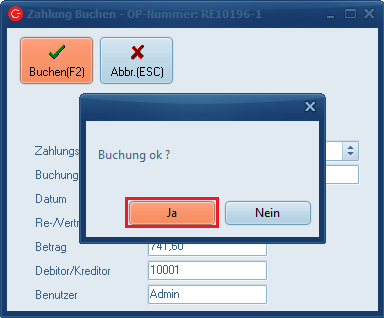 Die Rechnung wird dann mit „Abrechn.(F1)“ erstellt, das Rechnungsdatum mit Klick auf „OK(F2)“ bestätigt.