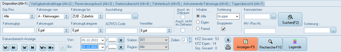 Durch Klicken auf diesen Button oder dem betätigen der Funktionstaste F10 auf Ihrer Tastatur wechseln Sie von der Dispo in den Modus "Recherche":
