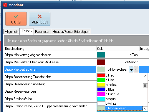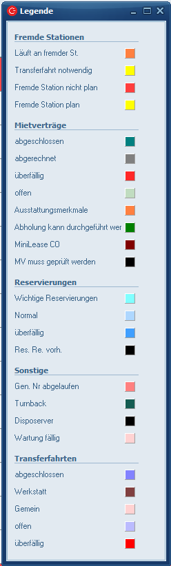 Wie Sie schon festgestellt haben, sind die einzelnen Mietverträge und Fahrzeuge mit verschieden Farben versehen. Die unterschiedlichen Farben haben die Funktion, den Status eines Fahrzeugs bzw. Mietvertrags sichtbar zu machen. Ein hellgrüner Balken bedeutet z.B., dass es zu einem Fahrzeug einen offenen Mietvertrag gibt, während ein hellblauer Balken zeigt, dass für das betreffende Auto eine Reservierung vorliegt. Die Legende zeigt Ihnen was die Standardfarben im Einzelnen bedeuten.