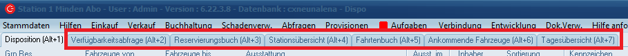 Wenn Sie ihr C-Rent-Software starten, ist (im Standard) automatisch die Registerkarte Disposition ausgewählt. Es stehen Ihnen allerdings noch weitere Registerkarten mit Optionen zur Verfügung: