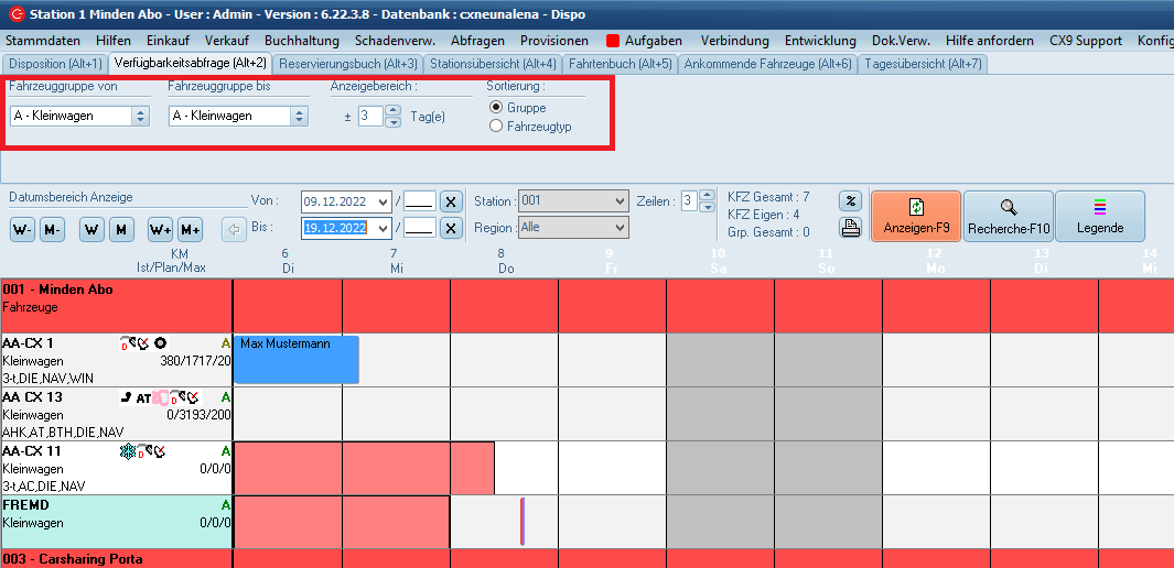 Dazu wählen Sie die Gruppe, bestimmen den Zeitraum und klicken dann auf den Reiter "Verfügbarkeitsabfrage" oder drücken gleichzeitig die Tasten Alt und 2. Jetzt werden Ihnen alle verfügbaren Fahrzeuge für diesen Zeitraum in den unterschiedlichen Stationen angezeigt.