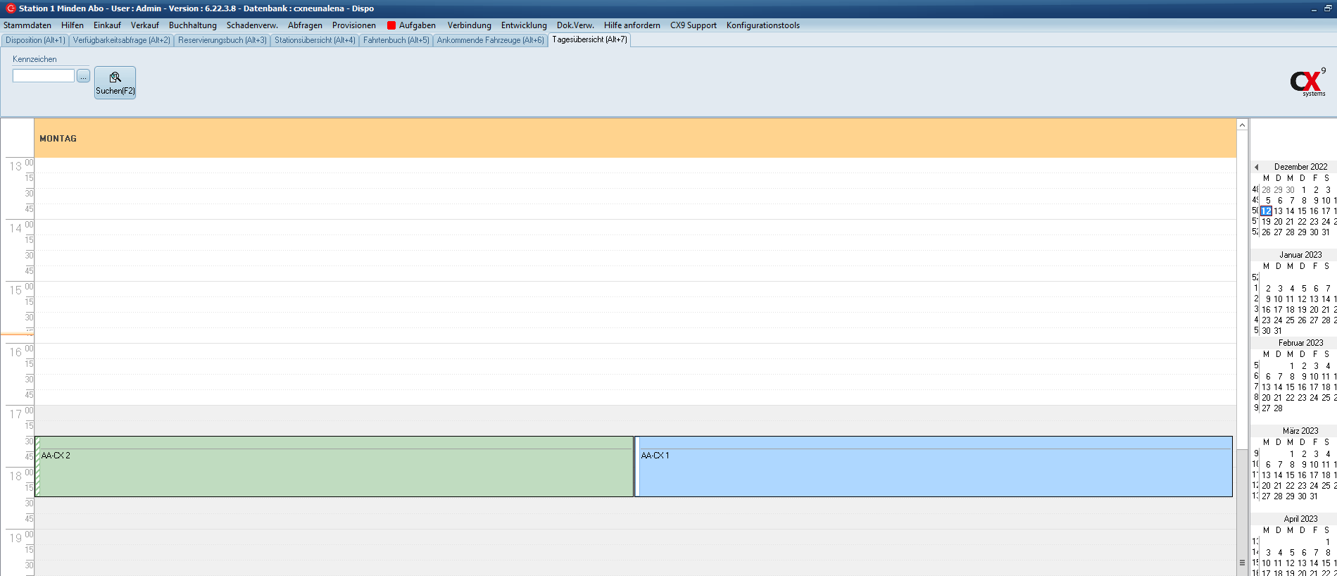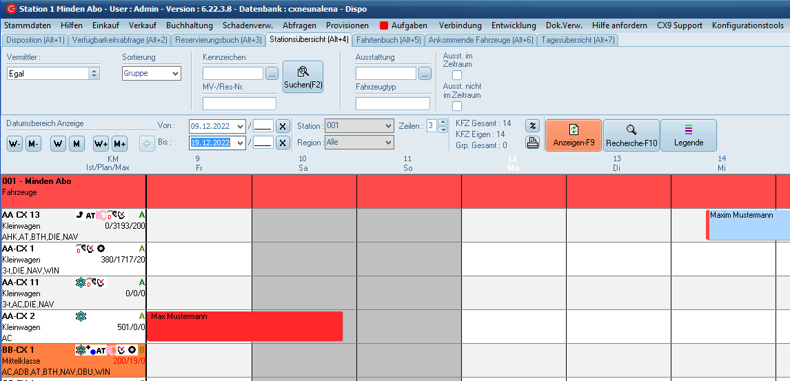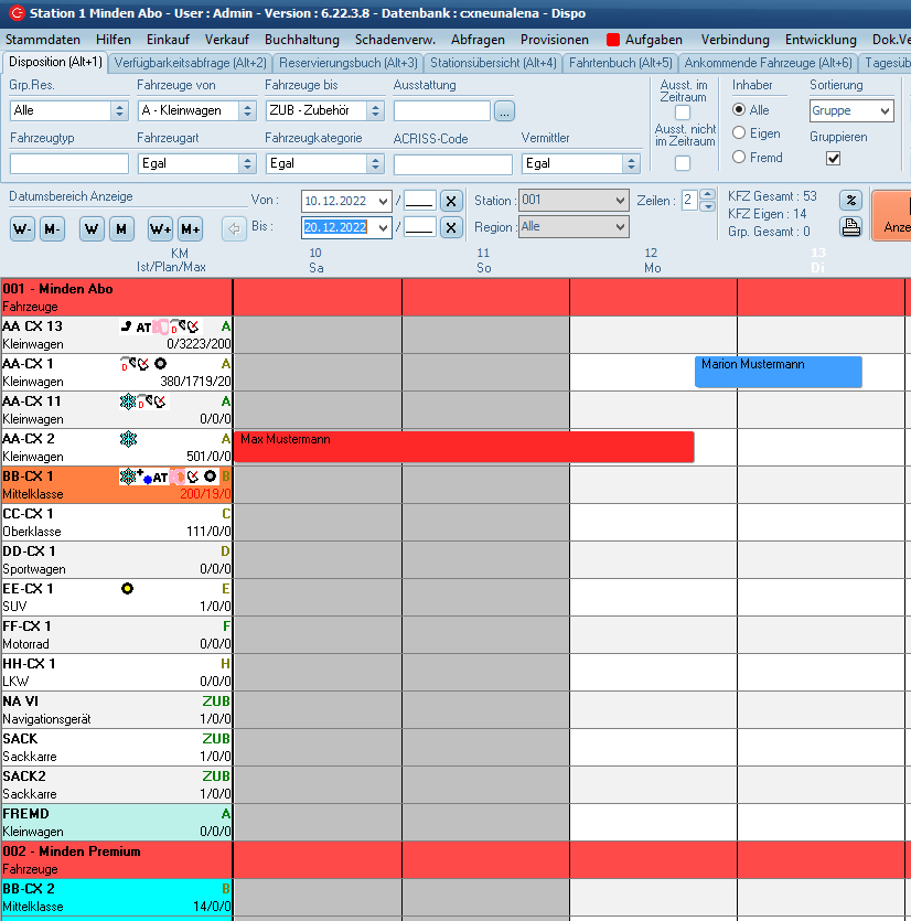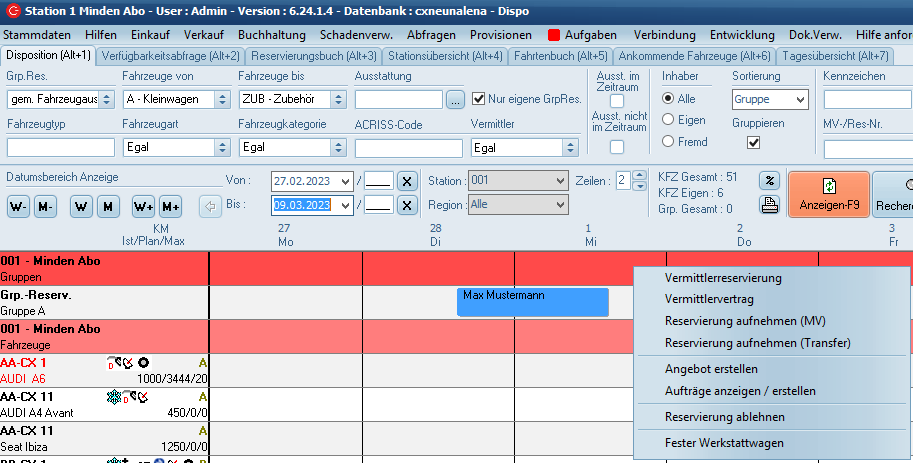 werden dabei übernommen, können aber auch noch geändert werden. Mit dem Anklicken von "OK" im Mietvertrags-Fenster ist die Reservierung in einen Vertrag gewandelt worden und wird in der Dispo in der entsprechenden Farbe angezeigt.
