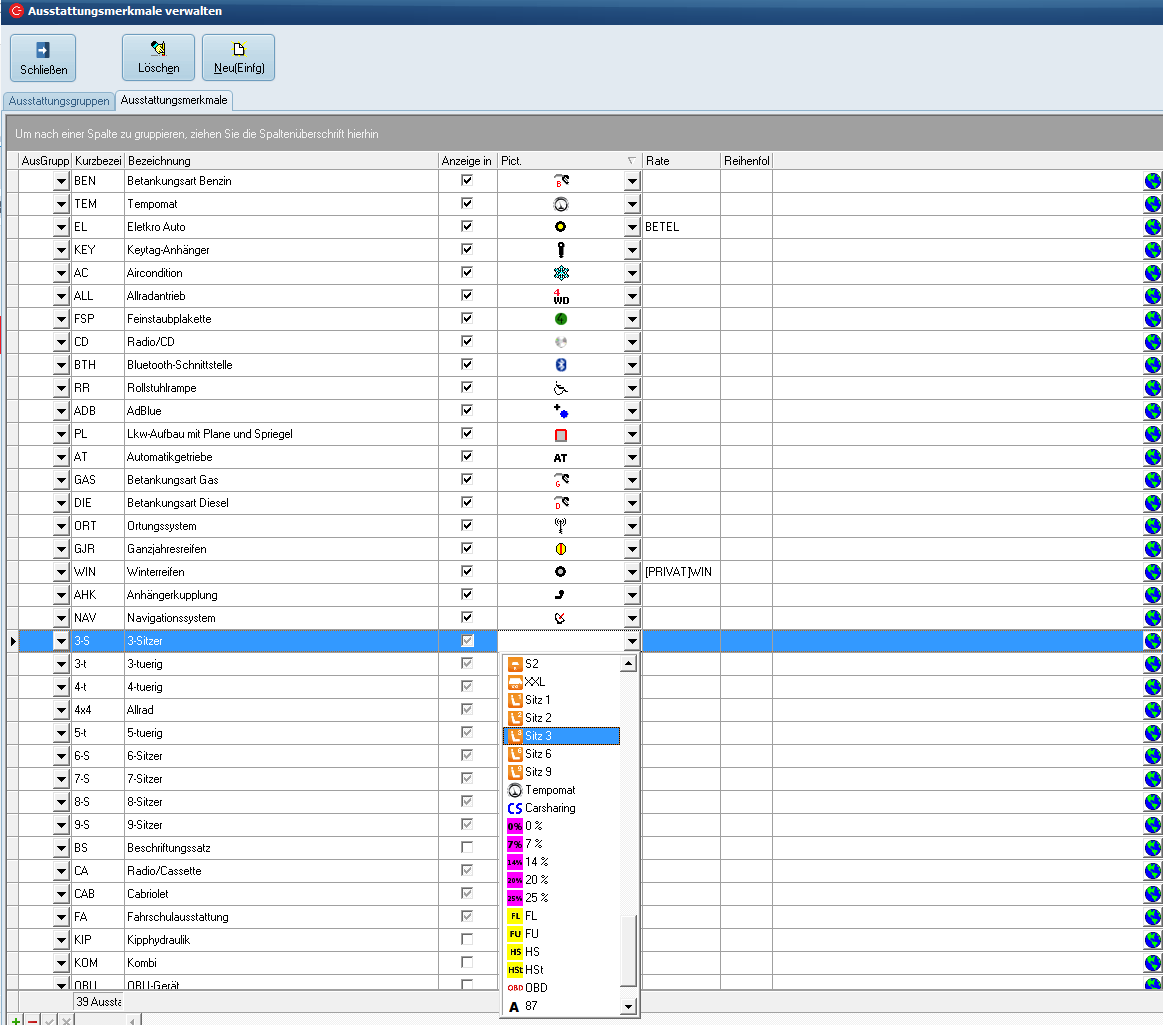 Über das Menü "Stammdaten" > "Fahrzeuge" > "Ausstattungsmerkmale" lässt sich diese Liste einsehen und ändern.
