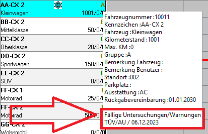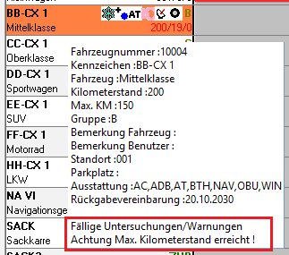 eines Mietvertrags oder einer Transferfahrt automatisch ein Informationsfenster mit dem Hinweis "Achtung - Fahrzeug nicht gepflegt" öffnen.