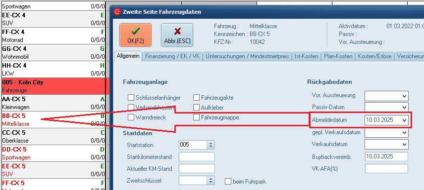 Ist ein Abmeldedatum ( auf der 2ten Seite im KFZ Stamm) gepflegt, so wird das Kennzeichen und der Fahrzeugtyp in rot angezeigt.