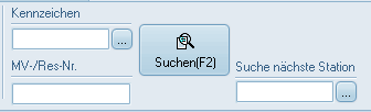 Die Eingabefelder "Kennzeichen und MV/Res-Nr." erlauben die Suche nach einzelnen Kennzeichen (oberes Feld) oder Mietvertrags- bzw. Reservierungsnummern (unteres Feld) in der Dispo. Linksklick auf die Schaltfläche "Suchen" oder Drücken der Funktionstaste F2 startet die Suche. Anklicken der Schaltfläche neben dem Kennzeichenfeld öffnet das Fenster mit der Fahrzeugsuche. Wird dort ein Kfz ausgewählt und die Schaltfläche "Übernehmen" gedrückt, so wird die Suche in der Dispo automatisch ausgeführt.