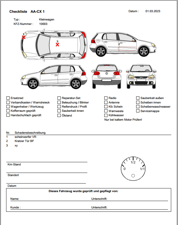 Druckt eine Seite, auf der die Schäden verzeichnet sind. Bei der Übergabe des Fahrzeugs können so dem Kunden die dokumentierten Schäden zur Kenntnis gebracht und neue Schäden nach der Rücknahme leichter zugeordnet werden.