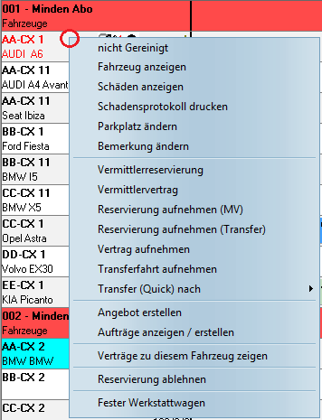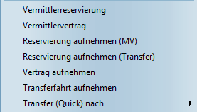 Der zweite Block enthält verschiedene Befehle zum Anlegen von Reservierungen, Mietverträgen und Transferfahrten. Anklicken der Menüpunkte öffnet zunächst das Fenster der Kunden/Fahrersuche. Ist dort ein Kunde oder Transferfahrer ausgewählt worden, öffnet sich das Vertrags-/Reservierungsfenster, in das alle relevanten Daten des Vorgangs eingetragen werden können. Nach Abschluss des Vorgangs mit "OK" ist dieser als farblich markierter Balken in der Dispo zu sehen. Mit einem Doppelklick auf den Balken lässt sich der Vorgang zum Bearbeiten öffnen.