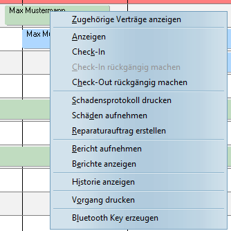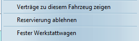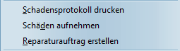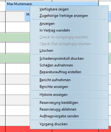 Ein Rechtsklick auf eine bestehende Reservierung öffnet ein Fenster, das aus sieben Blöcken besteht. Zu der schon bekannten Optionen "Schadensprotokoll drucken" sind die folgenden hinzugekommen: