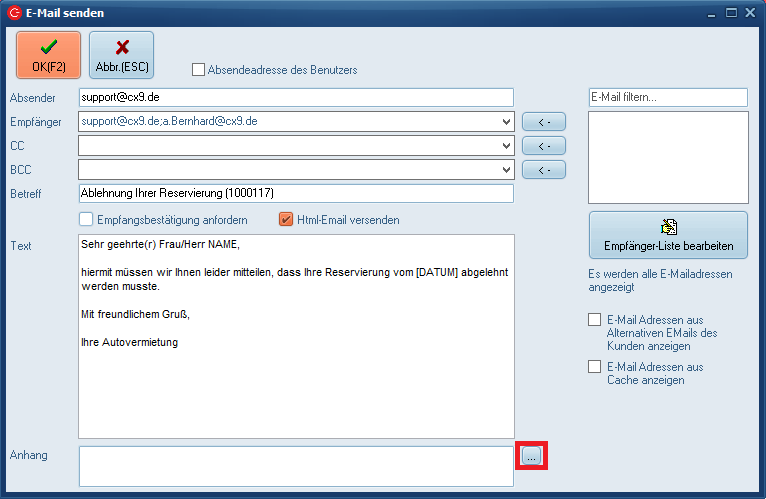 Sie können eine Reservierung natürlich auch ablehnen. Die Vorgehensweise unterscheidet sich nicht sonderlich von der Bestätigung einer Reservierung. Allerdings wird hier kein Dokument in die Anlage eingefügt. Sie können allerdings ein Dokument manuell einfügen, indem Sie auf den Button mit den drei Punkte klicken und die betreffende Datei auswählen.