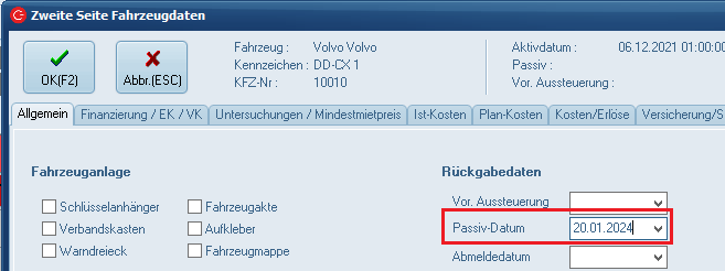 Wenn in der Dispositionsmaske nach einem Fahrzeug gesucht wird, verhält es sich so, dass wenn das Fahrzeug ein eingetragenes Passivdatum hat welches vor dem "von Datum" der Dispo liegt, wird das "von Datum" der Dispo auf den Tag des Passivdatums und das "bis Datum" auf sechs Tage nach dem Passivdatum gesetzt. Dieses dient dazu auch ausgesteuerte Fahrzeuge in der Dispo zu finden. Das Passivdatum darf erst eingetragen werden, wenn das KFZ tatsächlich passiv ist/wird. Denn mit Eintrag des Passivdatum wird die Kostenrechnung auch nicht mehr weitergeführt.