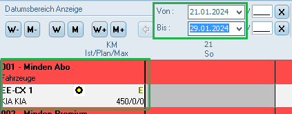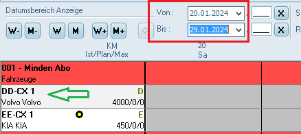 - "Ausst. im Zeitraum" & "Ausst. nicht im Zeitraum" geben Ihnen die Möglichkeit, nur Fahrzeuge anzeigen zu lassen, die im ausgewählten Zeitraum ausgesteuert bzw. nicht ausgesteuert werden.