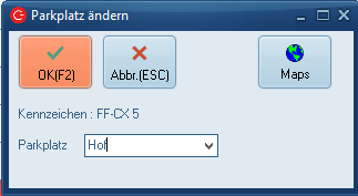 Durch Klick auf dieses Feld gelangen Sie zu einer Maske, in welcher Sie den aktuellen Parkplatz des Fahrzeugs eintragen bzw. ändern. Das Feld ist frei Beschreibbar.