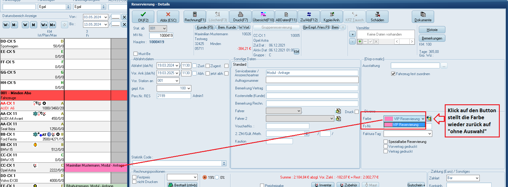 Die angelegten Farben können in Reservierung oder Vertrag gewählt werden.