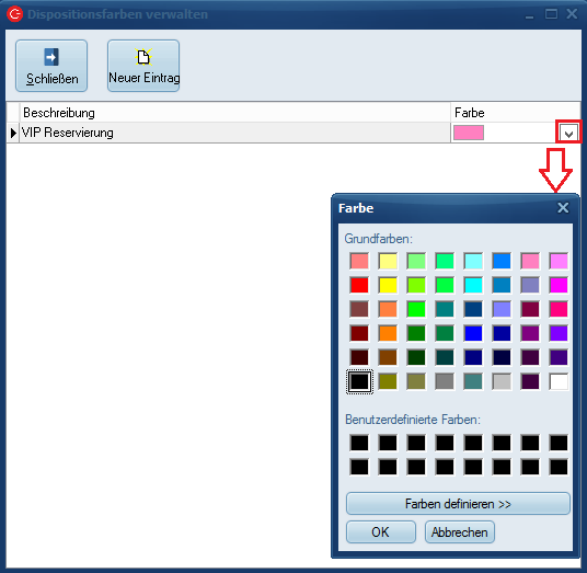 Um eine neue Zeile und somit neue Farbe anzulegen, betätigen Sie entweder die "Einfg"-Taste auf Ihrer Tastatur oder klicken auf den Button "Neuer Eintrag", geben Sie eine Beschreibung ein und wählen Sie eine Farbe aus.