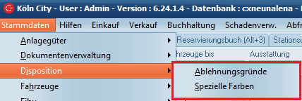 Zu den Masken "Ablehnungsgründe" und "Spezielle Farben" gelangen Sie über "Stammdaten" >"Disposition"
