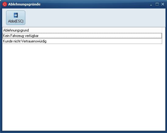 Zu dieser Maske gelangen Sie über "Stammdaten" >"Disposition" > "Ablehnungsgründe".