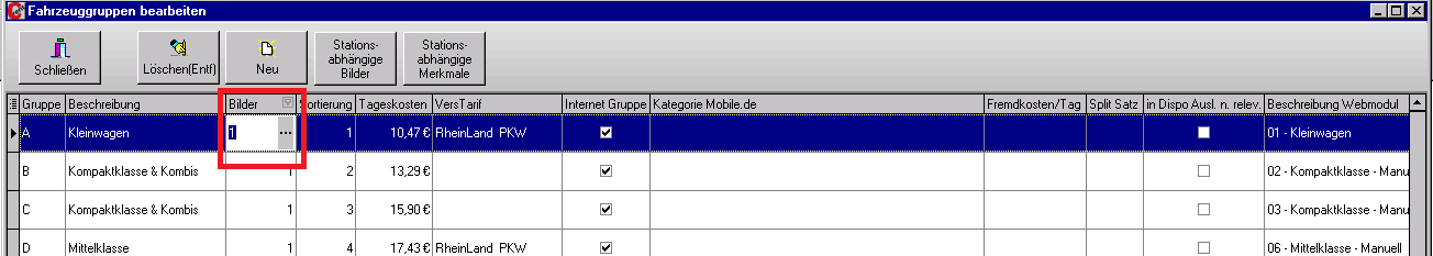 Hier können Sie Bilder hinterlegen, die dem Kunden dann im ORM (Online-Reservierungsmodul) stellvertretend für die jeweilige Fahrzeuggruppe angezeigt werden sollen. Es ist auch möglich,