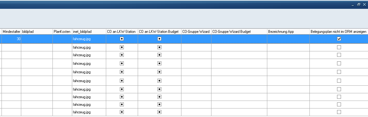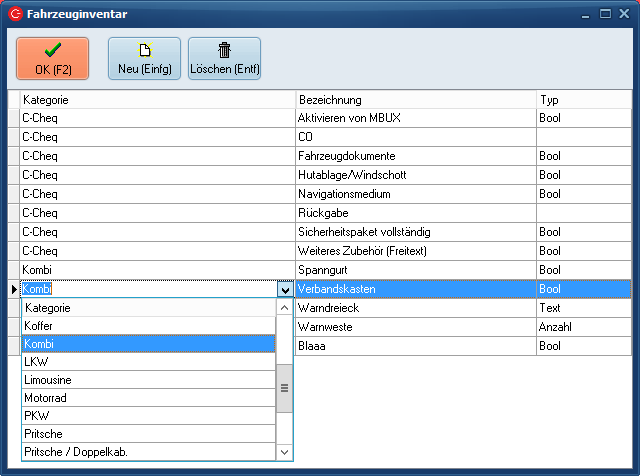 In die Spalte "Kategorie" wird die zugehörige Kategorie vermerkt. Wird hier z.B. für die Kategorie "Kombi" ein Inventargegenstand angelegt, kann dieser nur für Fahrzeuge der Kategorie "Kombi" gewählt werden. Soll ein Inventargegenstand für alle Fahrzeugkategorien wählbar sein, kann die Kategorie "IMMER DA" oder "Wählbar" gewählt werden.
