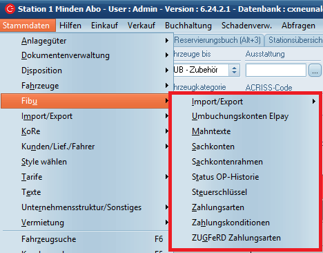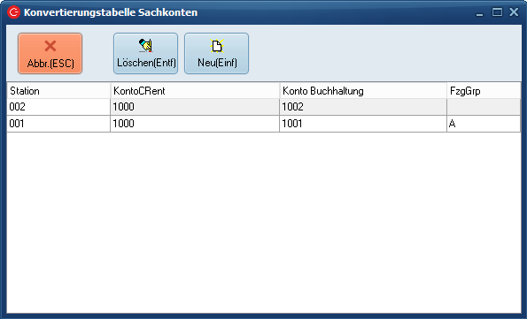Die Eingabe der Station und Fahrzeuggruppe (FzgGrp) ist optional. Das im C-Rent gebuchte Konto (Spalte KontoCRent) wird bei Übergabe an die Buchhaltung durch den Eintrag in der Spalte "Konto Buchhaltung" ersetzt.