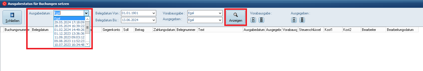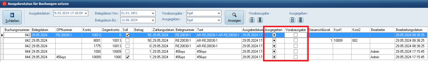 Die Haken der Spalten Ausgegeben und Vorabausgabe können auch für die gesamten Zeilen auf einmal gesetzt oder entfernt werden.