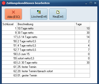 Um eine neue Zeile zu erstellen, klicken Sie auf den "Neu"-Button oder drücken die "Einfg"-Taste auf Ihrer Tastatur. Geben Sie bitte in der Spalte Schlüssel, die Schlüsselnummer der Zahlungskondition ein, in die Spalte Beschreibung die Beschreibung der Zahlungskondition und unter Tage die Fälligkeit der Zahlungskondition.