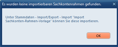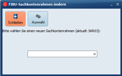 Nach Klick auf OK wird ein weiteres Fenster geöffnet, in dem Sie den Sachkontenrahmen wählen können. ( Die Auswahloptionen im Drop Down stehen erst nach Import der Sachkonten-Rahmen-Vorlage zur Verfügung.)