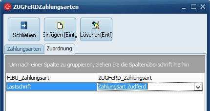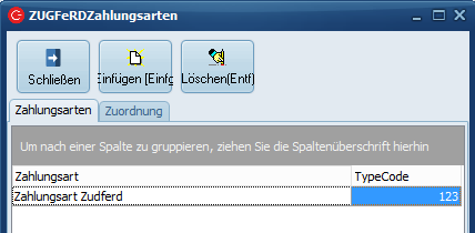 Es können abweichende Zahlarten für ZUGFeRD gepflegt werden. Erst legen Sie die gewünschte Zahlart im Reiter "Zahlungsarten" an -mit dem Typencode (von Zugferd)-, danach kann im Reiter "Zuordnung" die Zahlarten aus Zugferd der C-Rent Zahlart zugeordnet werden.