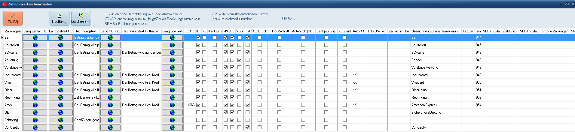 Bei Anwahl dieser Option öffnet sich eine Maske (siehe Abbildung), die Ihnen die Möglichkeit bietet, verschiedene Zahlungsarten einzupflegen.
