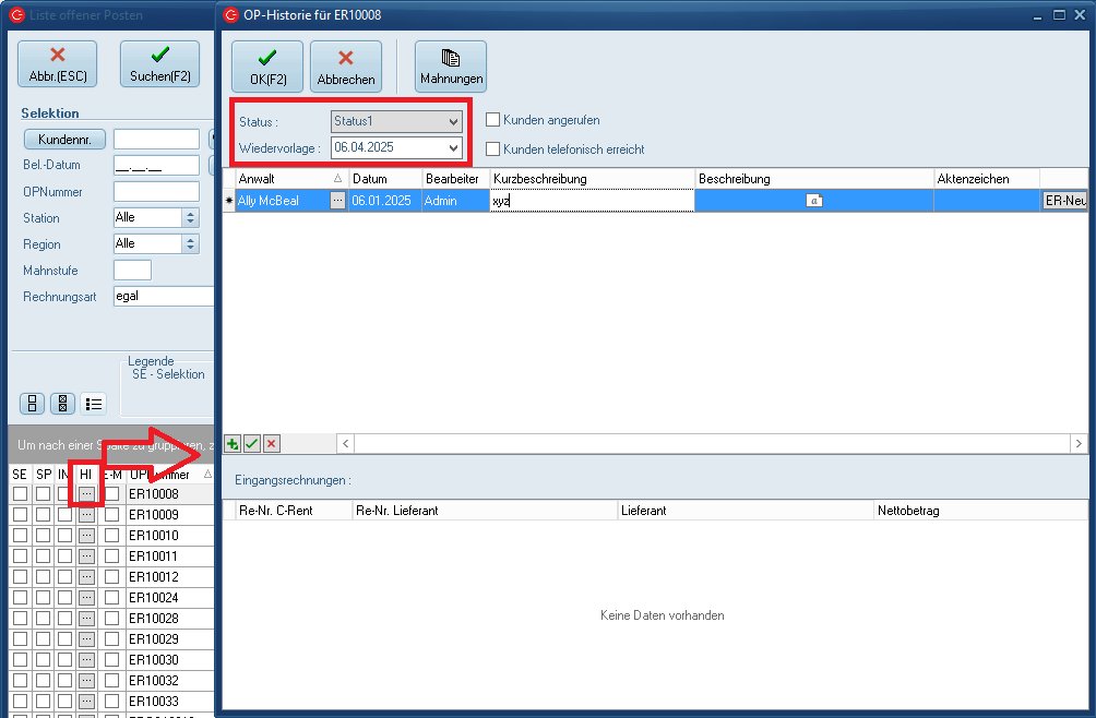 In der Maske Offene Posten, Spalte HI auf den Button mit den drei Punkte klicken und den gewünschten Status wählen. In der Maske kann dann eine Wiedervorlage erstellt werden.