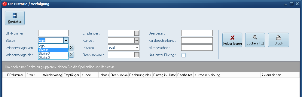 Hier können eigene Staus eingetragen werden, die über Buchhaltung > "OP-Historie / Verfolgung" selektiert werden können.