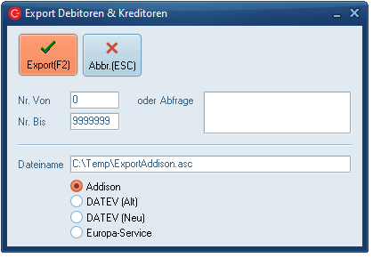Die Daten werden bei Auswahl Addison im Format "asc" erstellt, bei Auswahl Datev (Alt oder Neu) als CSV-Datei.